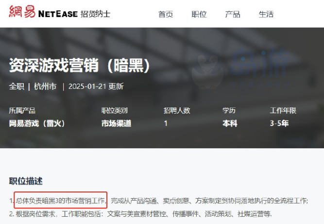 此外今年1月,网易在招聘官网上放出了雷火事业群对市场营销岗位的招聘需求,并在职位描述中明确标注了该岗位将“负责暗黑3的市场营销工作”。