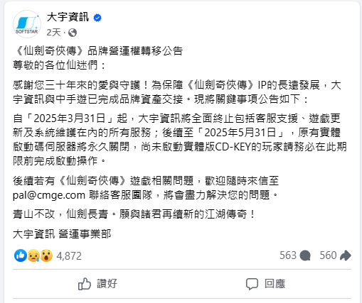 日前,大宇资讯宣布,将《仙剑奇侠传》品牌运营权正式转移至中手游娱乐集团,并从3月31日起,全面终止对该系列游戏的客服支持、游戏更新及系统维护等服务。