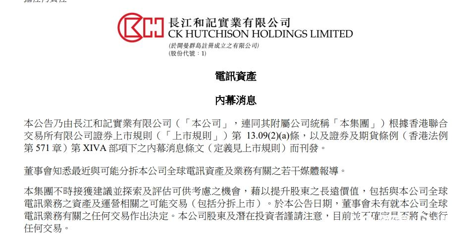 3月31日,长和在港交所发布公告表示,董事会知悉最近与可能分拆公司全球电讯资产及业务有关之若干媒体报道,于公告日期(3月31日),董事会未就公司全球电讯业务有关之任何交易作出决定,目前并不确定是否将会进行任何交易。
