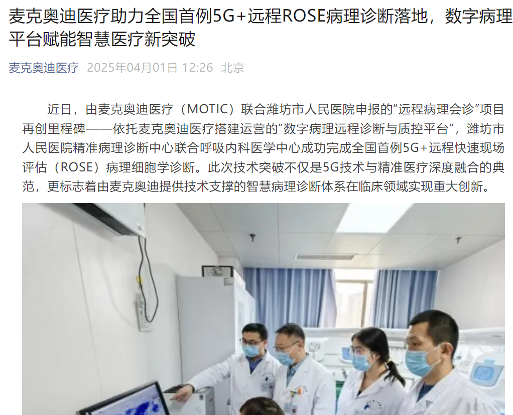 每经AI快讯,近日,由麦克奥迪医疗(MOTIC)联合潍坊市人民医院申报的“远程病理会诊”项目再创里程碑——依托麦克奥迪医疗搭建运营的“数字病理远程诊断与质控平台”,潍坊市人民医院精准病理诊断中心联合呼吸内科医学中心成功完成全国首例5G+远程快速现场评估(ROSE)病理细胞学诊断。此次技术突破不仅是5G技术与精准医疗深度融合的典范,更标志着由麦克奥迪提供技术支撑的智慧病理诊断体系在临床领域实现重大创新。