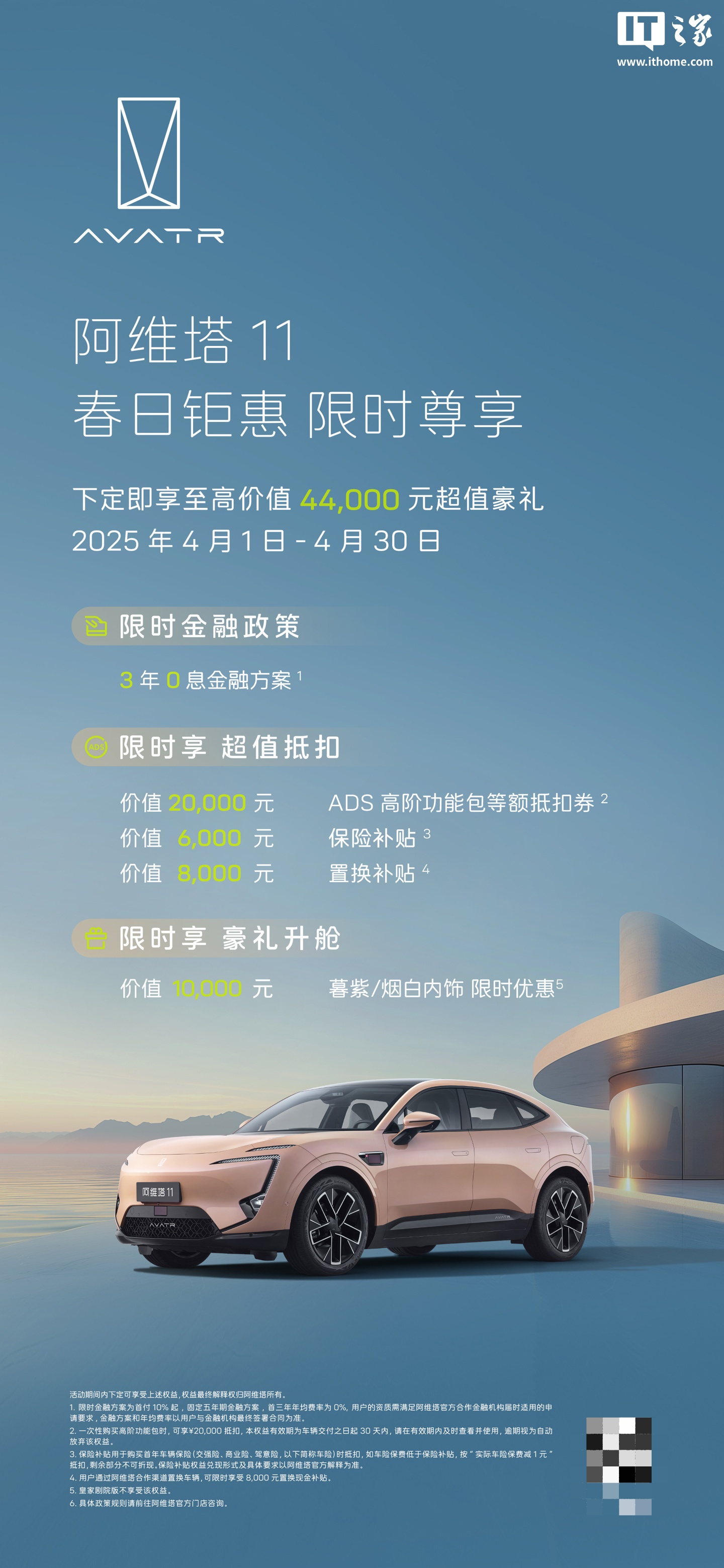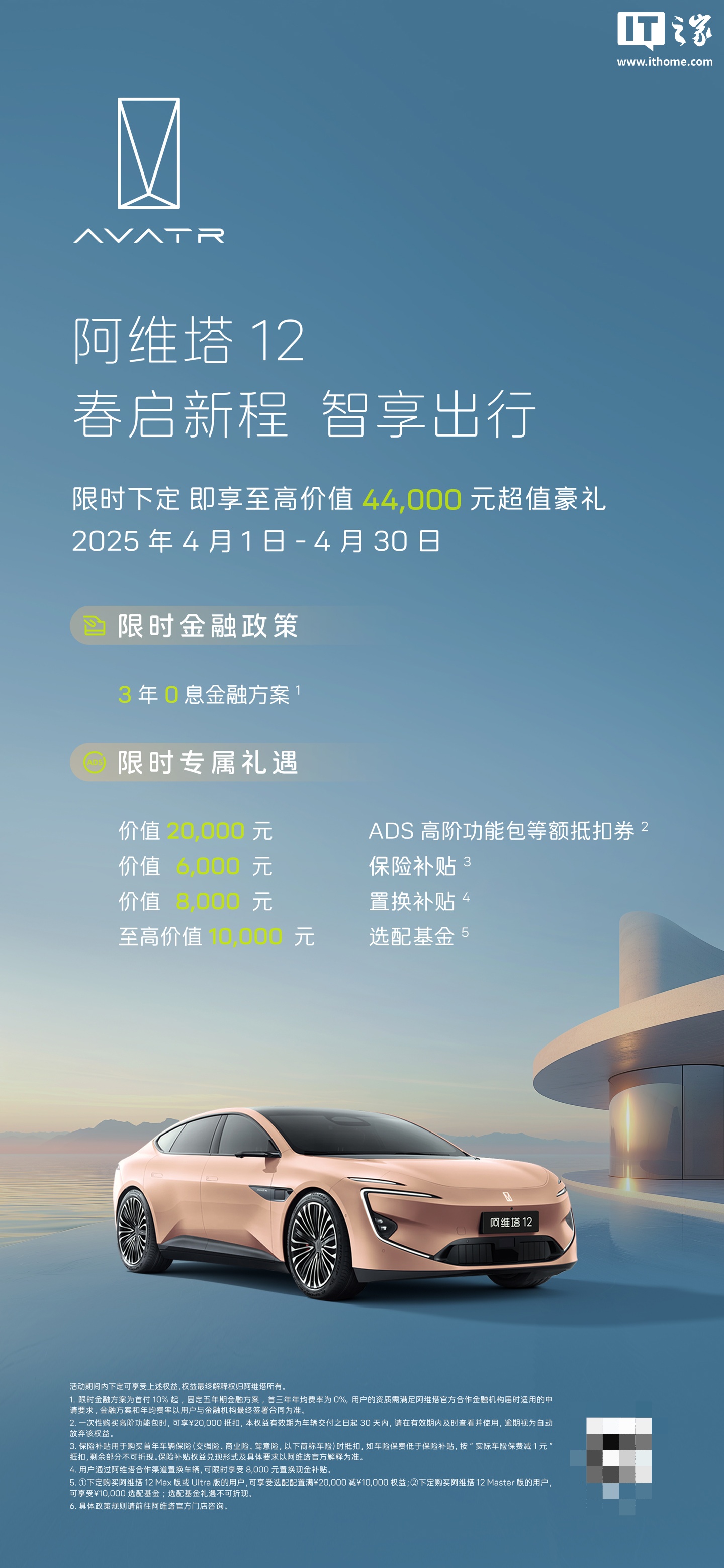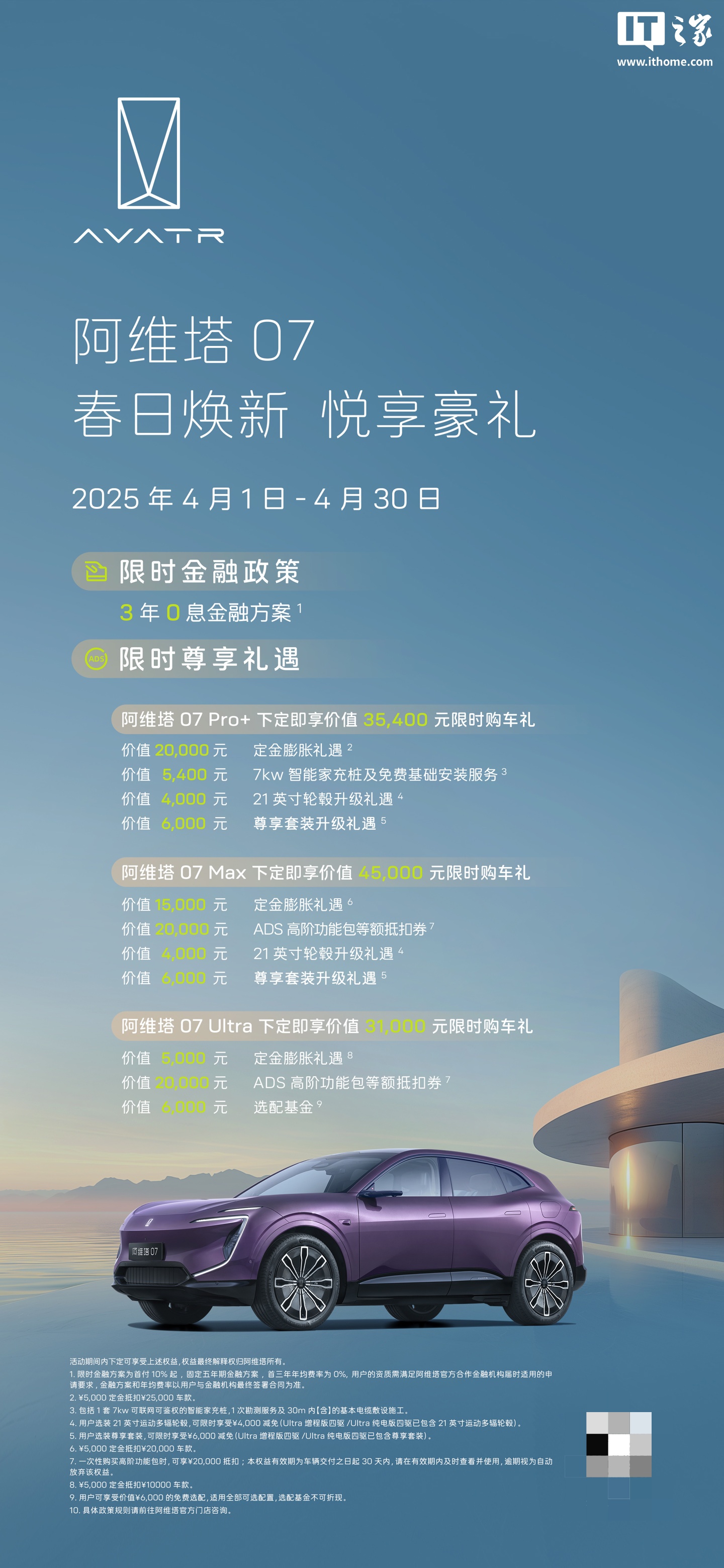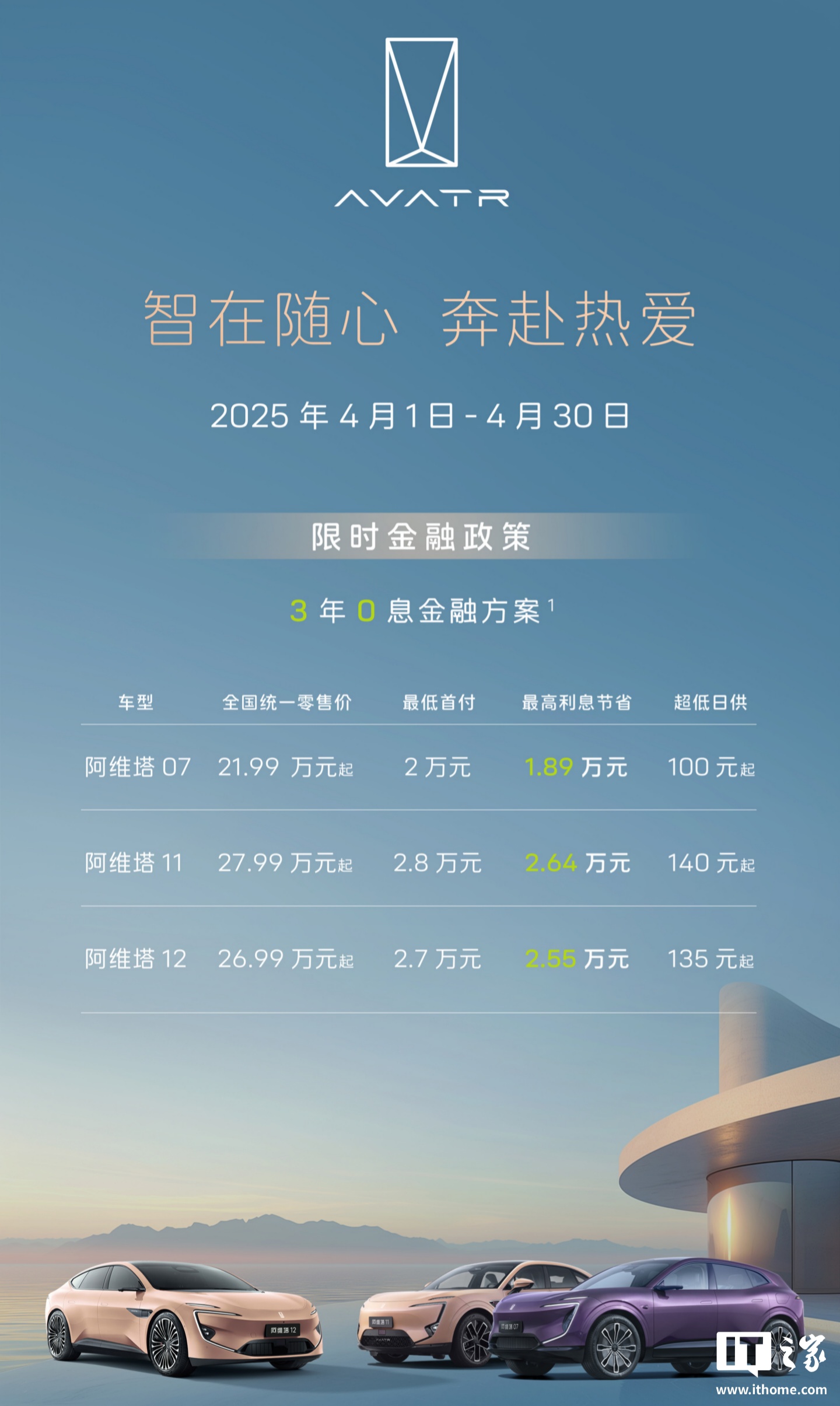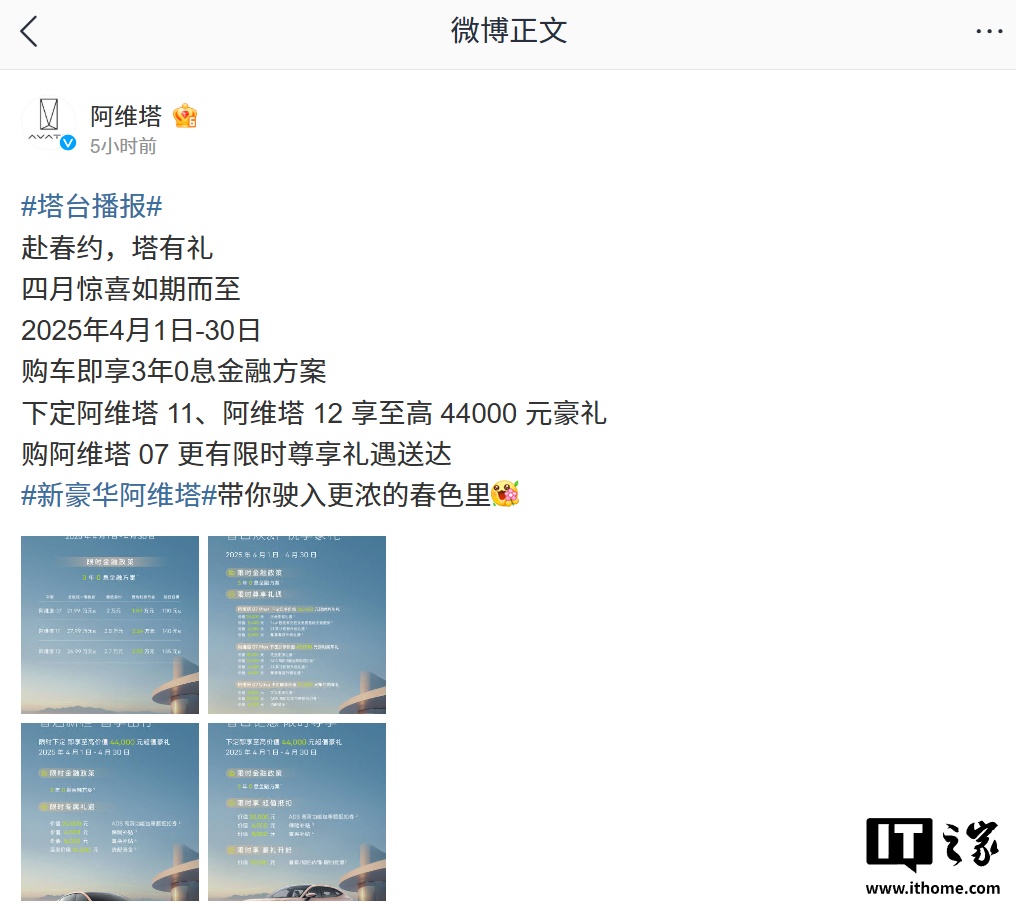 IT之家4月1日消息,阿维塔科技官方微博今日公布了4月购车活动,07/11/12三款车型将延续3年0息的购车限时金融政策。