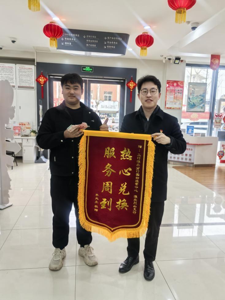 残币获“新生”,客户展“笑颜”。2025年2月20日,李先生将一面写有“热心兑现服务周到”的锦旗送到工行淮北烈山支行,并表示,此次兑换火烧币的暖心举动,彰显了工行服务百姓民生、守护市民财产安全的担当与责任。