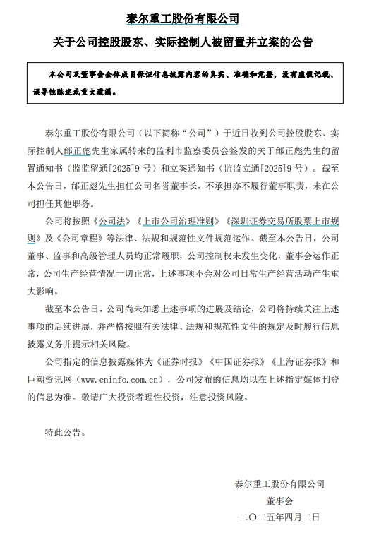 中新经纬4月1日电泰尔股份1日盘后发布公告称,近日收到公司控股股东、实际控制人邰正彪家属转来的监利市监察委员会签发的关于邰正彪的留置通知书。截至本公告日,邰正彪担任公司名誉董事长,不承担亦不履行董事职责,未在公司担任其他职务。