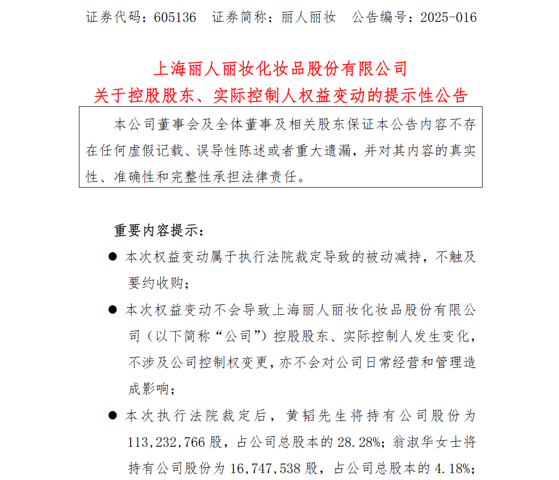 4月1日,上海丽人丽妆化妆品股份有限公司(605136SH,以下简称“丽人丽妆”)发布公告,披露了控股股东、实际控制人黄韬与其前妻翁淑华之间的股权分割进展,标志着这场历时已久的离婚财产纠纷终于尘埃落定。据悉,本次股权分割价值过亿。