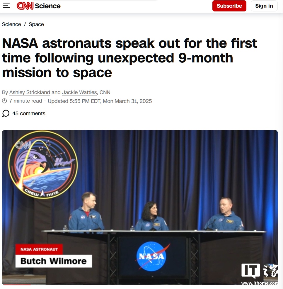 IT之家4月2日消息,据CNN报道,两名原计划在近地轨道停留一周的宇航员因飞船故障意外滞留太空九个多月后,于3月18日返回地球,并在当地时间本周一首次举行公开新闻发布会。