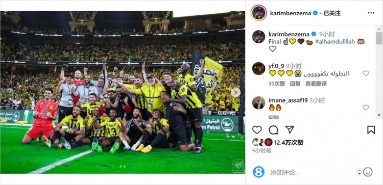 本泽马赛后更新社媒动态,晒出全队庆祝胜利的合照,配文:“决赛。”