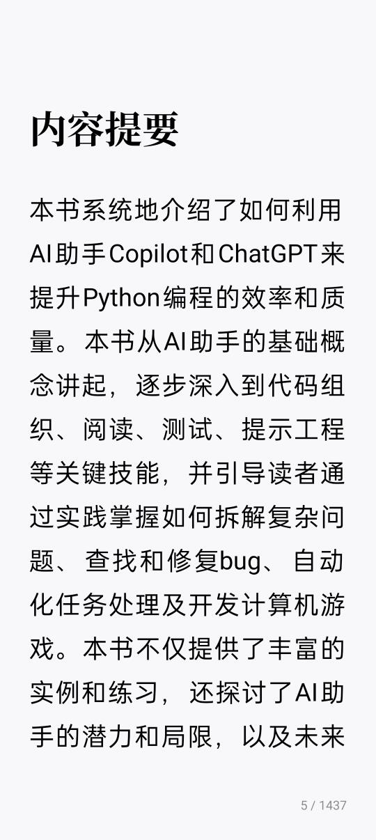 本书系统地介绍了如何利用AI助手Copilot和ChatGPT来提升Python编程的效率和质量。 本书从AI助手的基础概念讲起,逐步深入到代码组织、阅读、测试、提示工程等关键技能,并引导读者通过实践掌握如何拆解复杂问题、查找和修复bug、自动化任务处理及开发计算机游戏。本书不仅提供了丰富的实例和练习,还探讨了AI助手的潜力和局限,以及未来的发展趋势,是希望在编程领域融入AI技术的读者的理想选择。 本书适合对编程感兴趣,希望借助AI技术提升编程能力的初学者和中级程序员阅读。