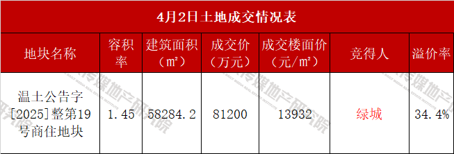 温土公告字[2025]整第19号地块用地面积40196㎡,容积率1.45,建筑面积58284.2㎡。最终经过66轮报价,由绿城以81200万元总价竞得,楼面价13932元/㎡,溢价率34.4%。