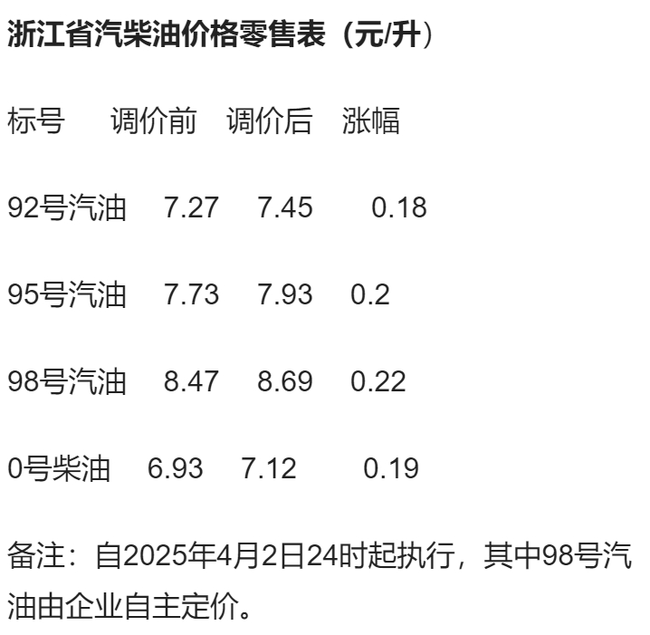 根据浙江省发改委消息,此次调价后,浙江省92号汽油为7.45元/升,每升上涨0.18元,私家车加满一箱油(以50升计算)要多花9元钱;95号为7.93元/升,每升上涨0.2元;0号柴油为7.12元/升,每升上涨0.19元,“6”字头的0号柴油价格仅仅维持了两周。