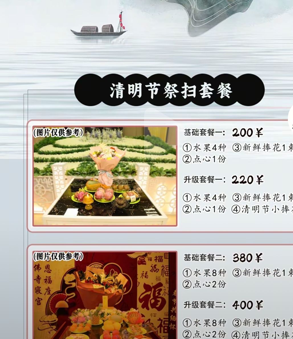 此外,当地一家墓园提供的清明节“代客祭扫”套餐显示,不同套餐价格不同。260元的基础套餐包括水果四种、新鲜捧花一束、点心一份、代客祭扫服务,280元的升级套餐增加清明小捧花;380元的基础套餐包括水果八种,新鲜捧花一束、点心两份,400元的升级套餐增加清明小捧花。