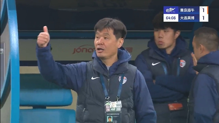 直播吧04月02日讯中超第4轮,青岛海牛vs大连英博。比赛第65分钟,萨里奇禁区外直接凌空破门,海牛1-1扳平比分,主帅李霄鹏送上一个赞!