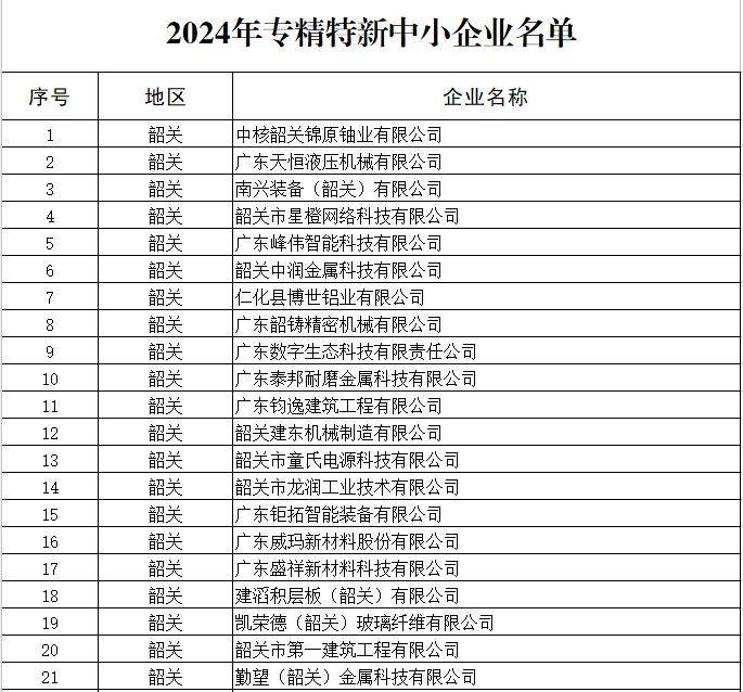 近日,广东省工业和信息化厅发布了《广东省工业和信息化厅关于公布2024年专精特新中小企业和2021年到期复核通过企业名单的通告》,韶关市共有21家企业上榜专精特新中小企业名单,13家企业2021年到期复核通过。