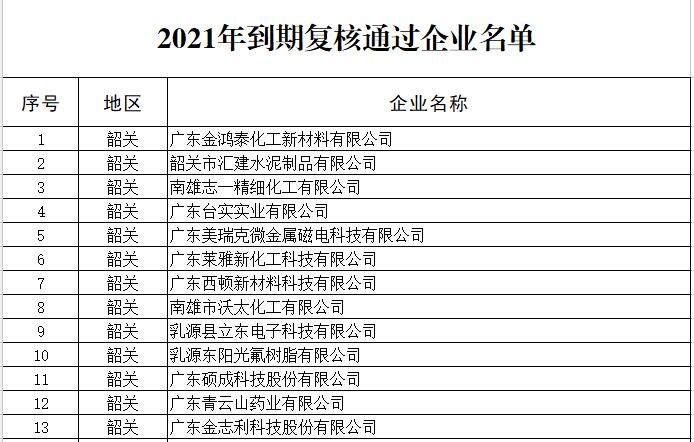 其中,韶关高新区企业韶关星橙网络科技有限公司、广东数字生态科技有限责任公司2家企业上榜;韶关市汇建水泥制品有限公司、广东莱雅化工科技有限公司2家企业到期复核通过。
