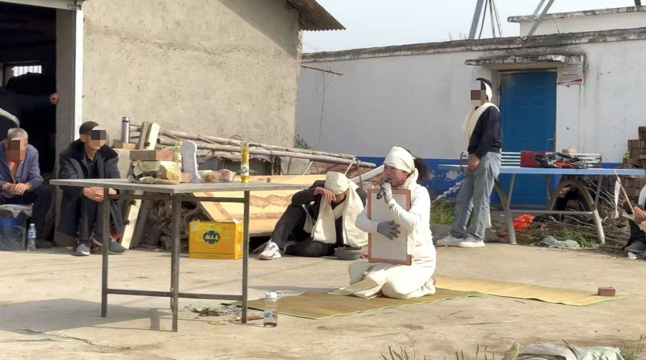 掌握情况、拿到孝布后,已基本到饭点。张金凤没有时间写下草稿,只在脑海里迅速复盘,并搜寻字句,迅速形成哭灵唱词。吃完午饭,等主办方祭拜结束、行完礼,就到了哭灵环节。