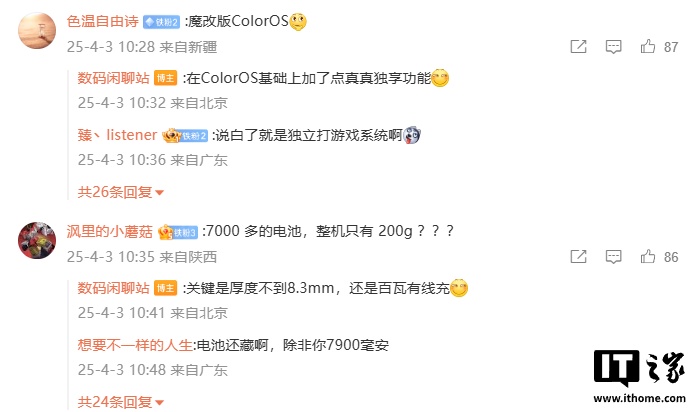 博主还在评论区回复了部分网友的问题:针对什么是魔改版ColorOS,博主表示“在ColorOS基础上加了点真真独享功能”;针对用户对新机电池和重量的疑问和惊讶,博主回复“关键是厚度不到8.3mm,还是百瓦有线充”。