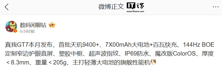IT之家4月3日消息,博主@数码闲聊站今日发文透露,真我GT7手机首批搭载天玑9400+处理器、内置“7X00mAh电池”(容量超7000mAh)、配备144HzBOE定制窄边护眼直屏。