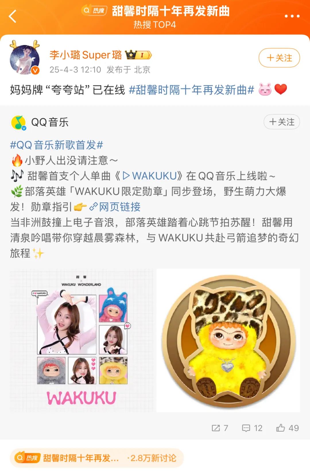 4月3日,李小璐和贾乃亮的12岁女儿甜馨,正式推出个人首支单曲《WAKUKU》。