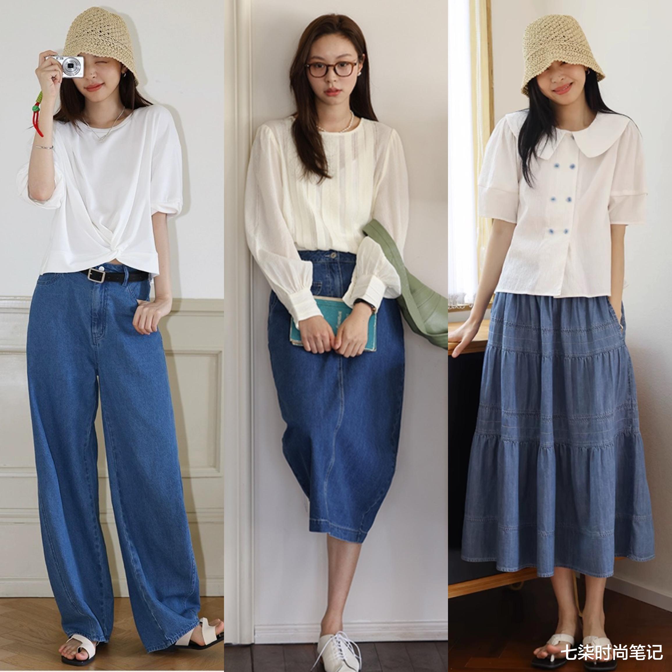 日常想要穿得休闲放松,可以用白T恤、白衬衫搭配牛仔裤和牛仔裙,经典的蓝白配色,百搭不挑人,不仅能呈现清爽的感觉,也显得整个人元气活力。