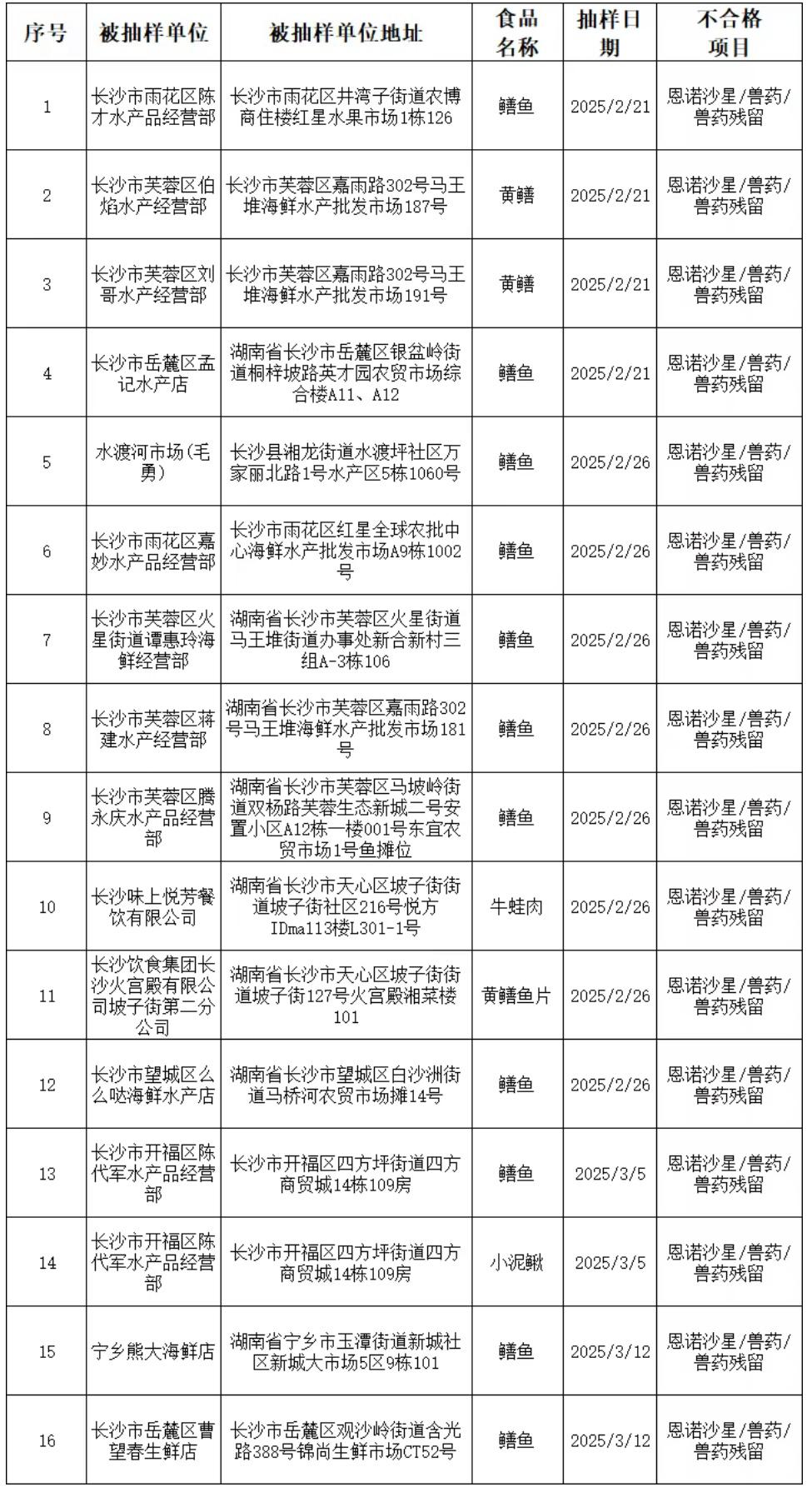 记者在长沙市市场监管局官网看到,第一季度重点风险水产品抽检不合格结果已经公示。其中有14批次鳝鱼(鳝鱼、黄鳝、黄鳝鱼片)不合格,1批次小泥鳅不合格,1批次牛蛙肉不合格,不合格项目均为恩诺沙星/兽药/兽药残留。