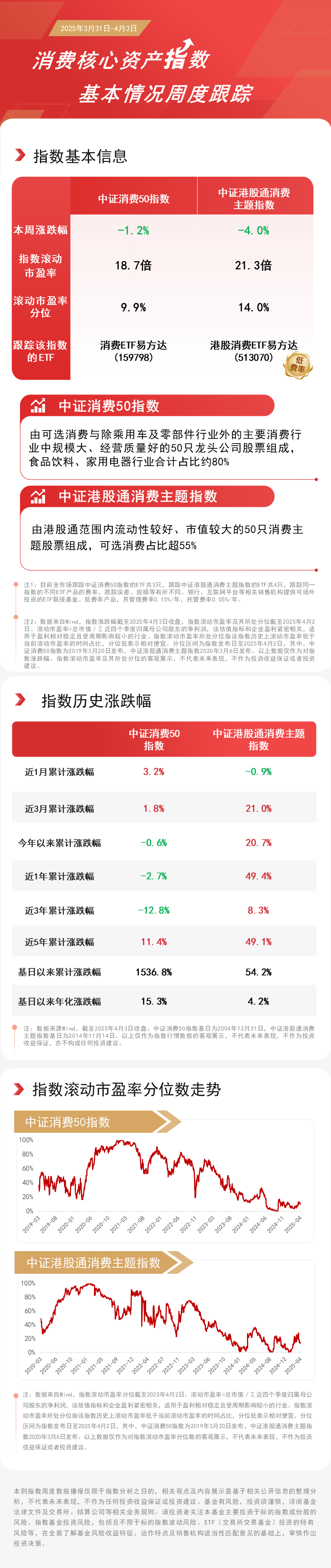本周中证消费50指数下跌1.2%,中证港股通消费主题指数下跌4%。