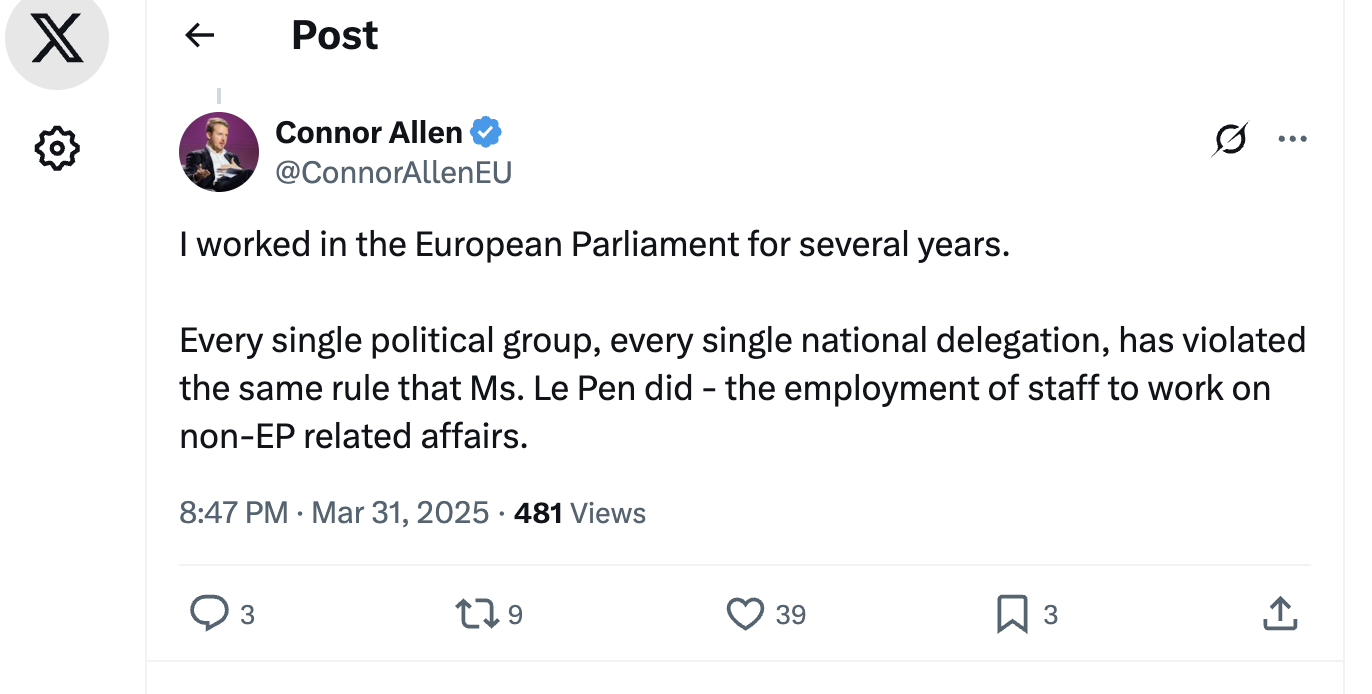 康纳·艾伦就勒庞被判决发表评论图源:X