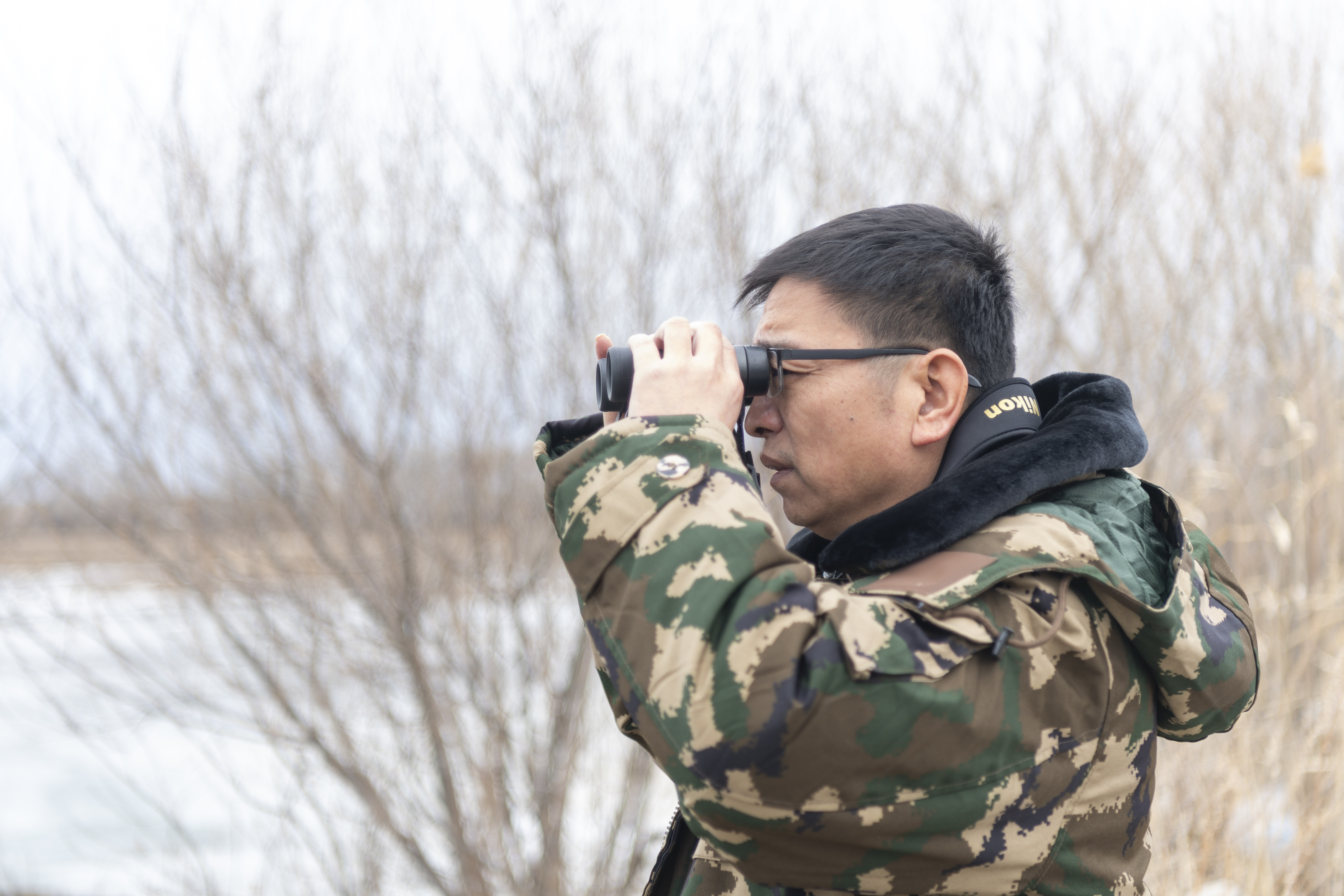 4月1日,黑龙江兴凯湖国家级自然保护区管理局科研宣教中心主任刘化金在保护区内观测候鸟。
