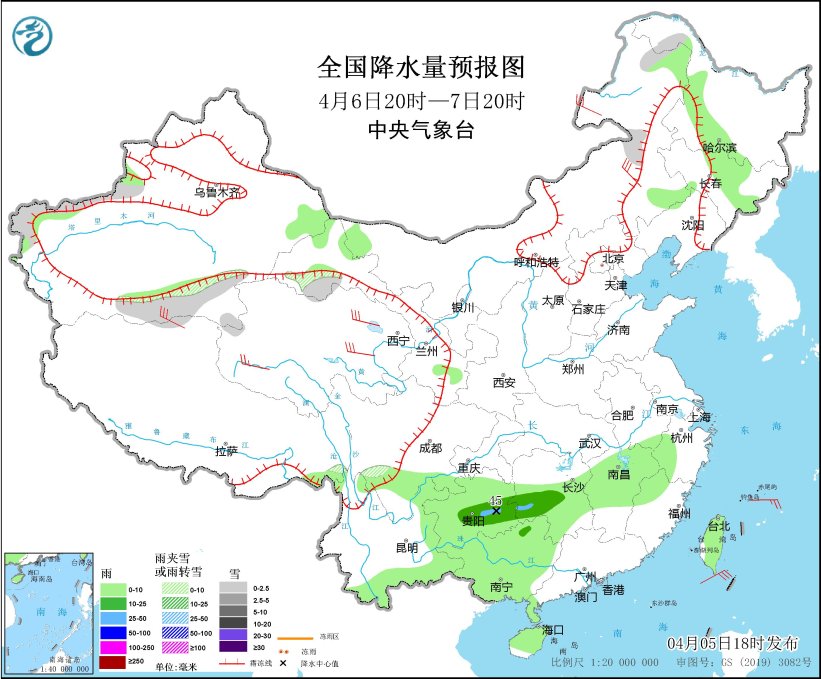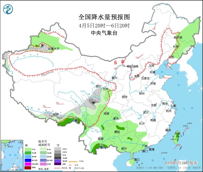 4月5日20时至6日20时,新疆沿天山高海拔地区、西藏东部、青海东南部、甘肃南部、川西高原北部、吉林中东部等地部分地区有小到中雪或雨夹雪,局地有大雪(5~8毫米)。新疆北疆大部、西藏东南部以及东北地区中东部、西南地区中东部、江南西南部、华南西部、海南岛北部、台湾岛等地部分地区有小到中雨,局地有大雨(25~30毫米)。内蒙古大部、辽东半岛、山东半岛等地部分地区有4~6级风(见图1)。