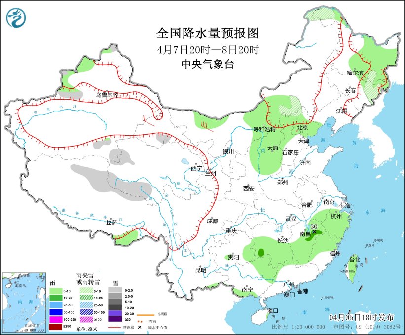4月7日20时至8日20时,内蒙古中东部、黑龙江西北部和东南部、吉林东部、新疆伊犁河谷、西藏北部、青海南部和西部、甘肃河西等地部分地区有小雪或雨夹雪。内蒙古中西部、黑龙江西北部、新疆北疆北部、陕西北部以及华北大部、江南大部、华南北部、台湾岛等地部分地区有小到中雨,其中,江西北部等地部分地区有大雨(25~30毫米)。内蒙古西北部、甘肃河西部分地区有4~6级风,阵风7级(见图3)。