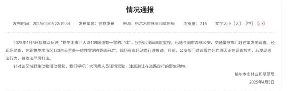 2025年4月5日接群众反映“格尔木市西大滩109国道有一雪豹尸体”。接报后我局高度重视,迅速会同市森林公安、交通警察部门赶往事发地调查。经现场勘查,在距格尔木市区130余公里处一雄性雪豹在路面死亡,现场有车轮沾血行驶痕迹。目前,公安部门对该雪豹死亡原因正在调查核实,若发现违法行为,将依法严厉打击。