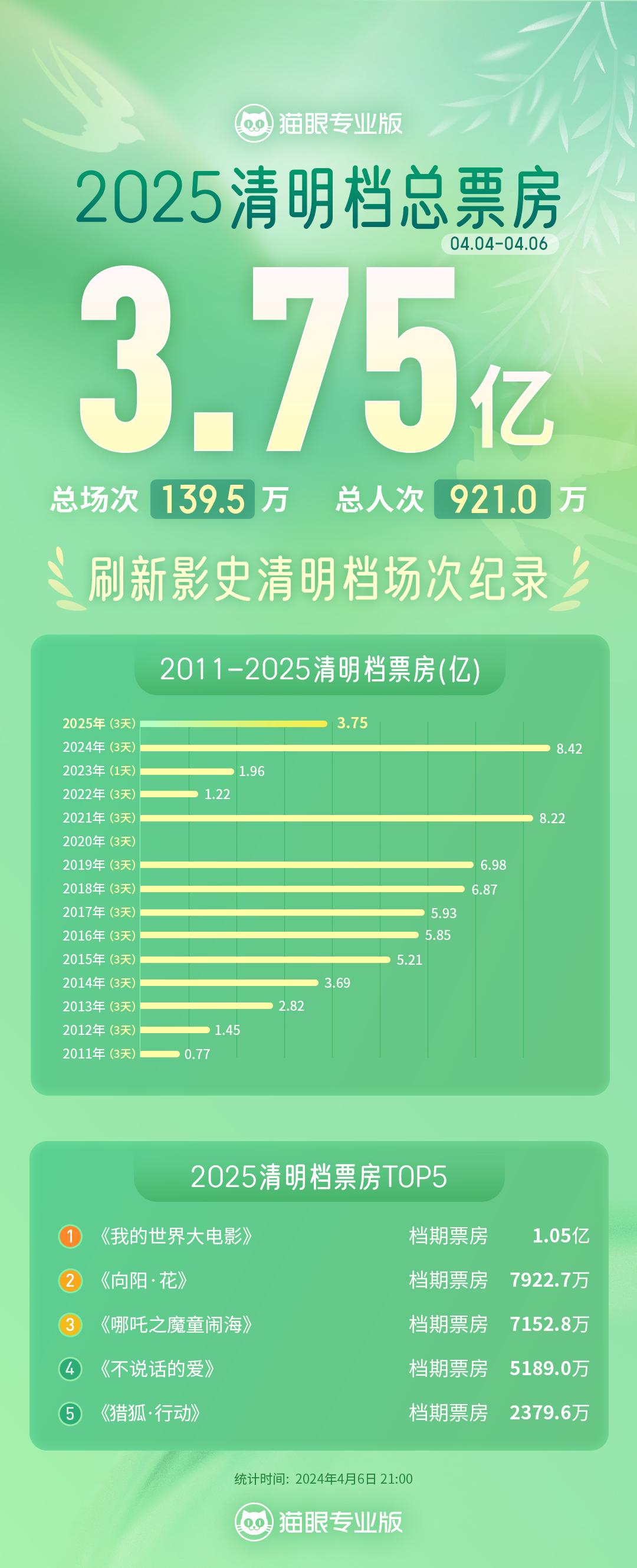 据猫眼专业版数据,截至4月6日21时,2025清明档总票房3.75亿元,观影总人次921.0万,总场次139.5万,刷新中国影史清明档场次纪录。