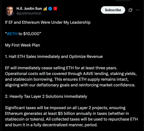 2024年新一轮行情,以太坊表现疲软,孙宇晨因巨额ETH持仓再陷风口浪尖。社区传言四起:亏损、做空、清仓……他却化身生态建设者,抛出大胆设想:若执掌以太坊基金会,可推动价格增长。