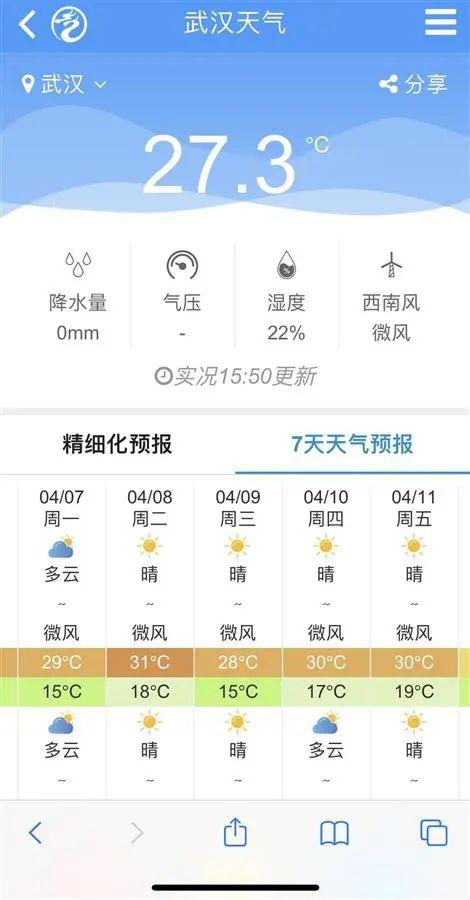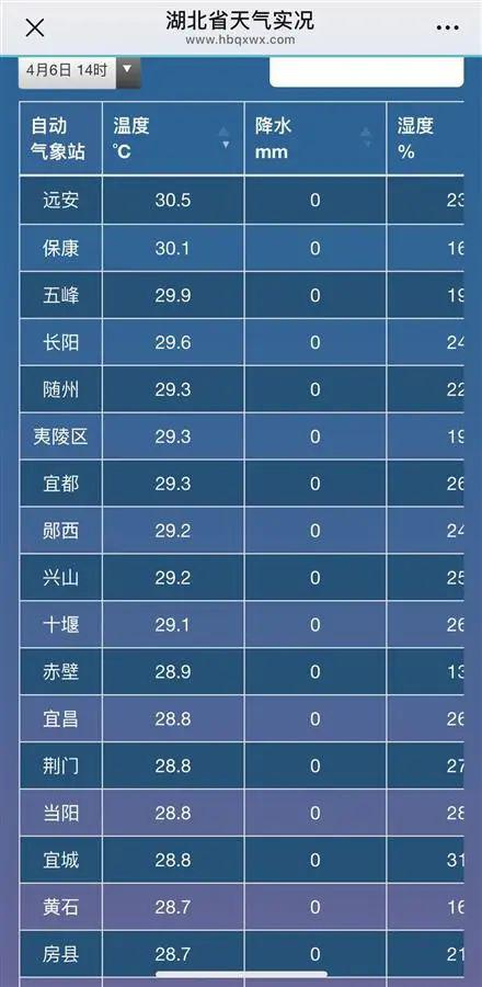 昨日(4月6日),湖北大部地区最高温度都在27°C以上,中西部地区气温高于东部,比如,随州、十堰、宜昌、荆门等地气温都在28°C以上,远安、保康更是超过了30°C,而武汉、黄冈仅26.7°C,咸宁27.6°C。