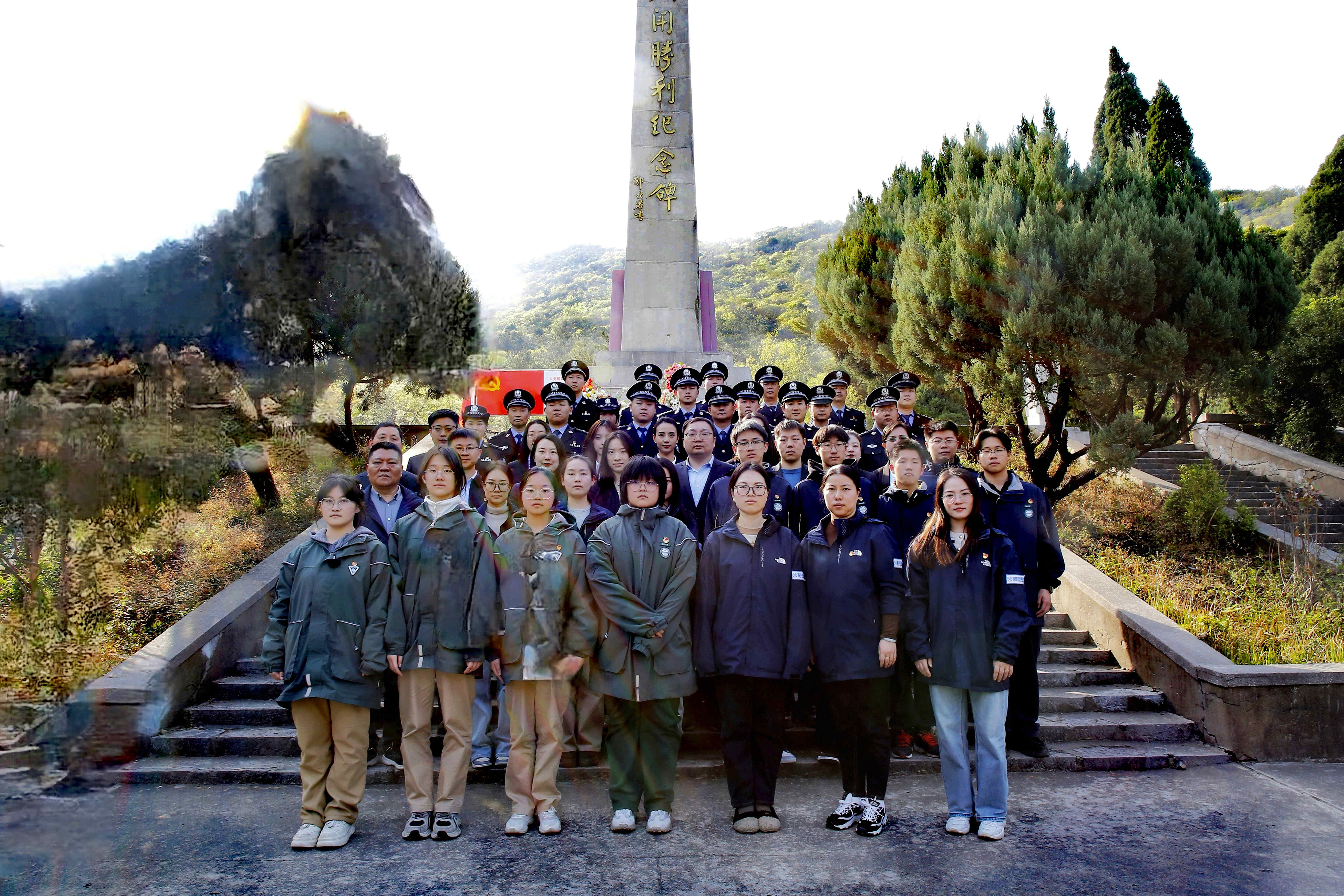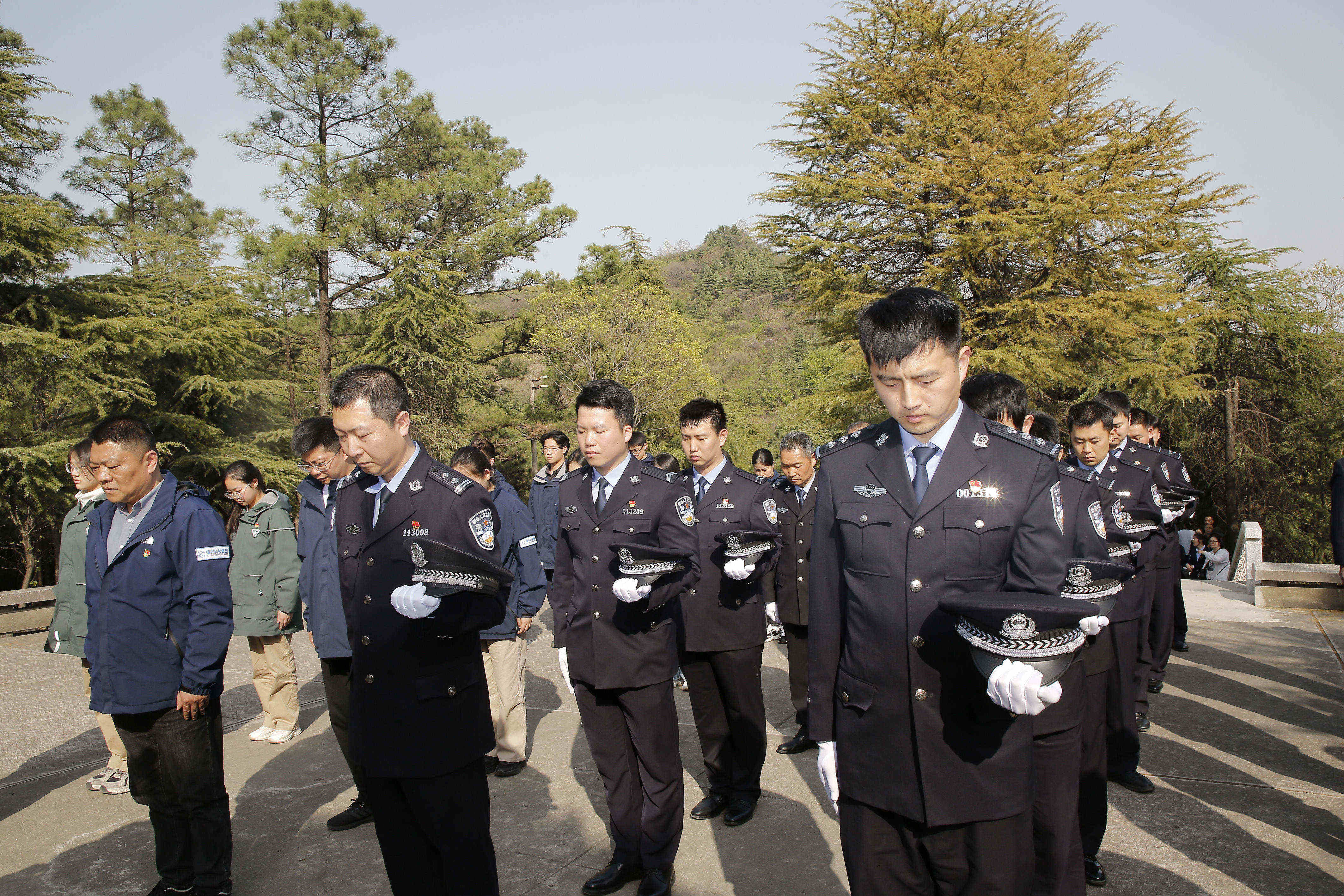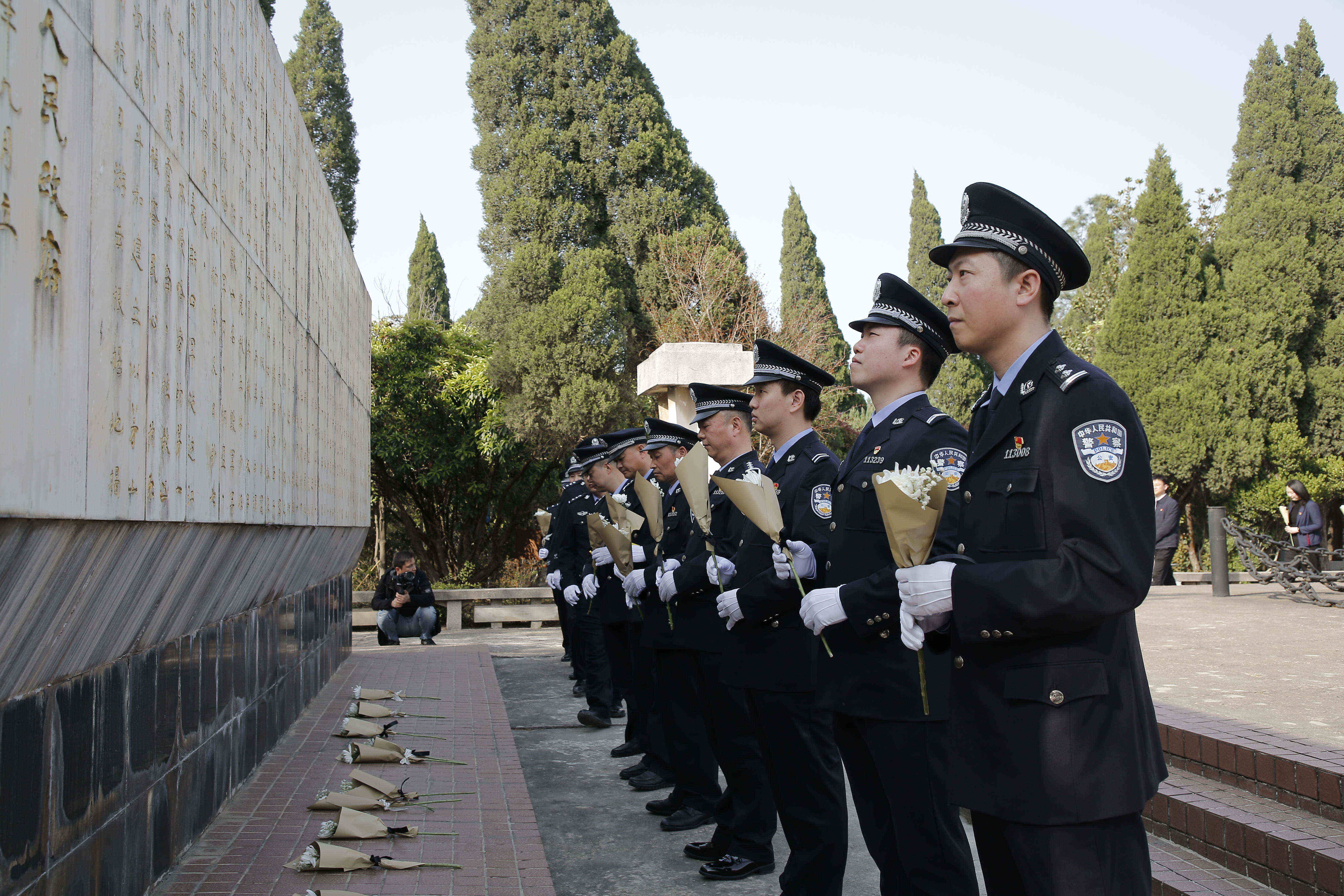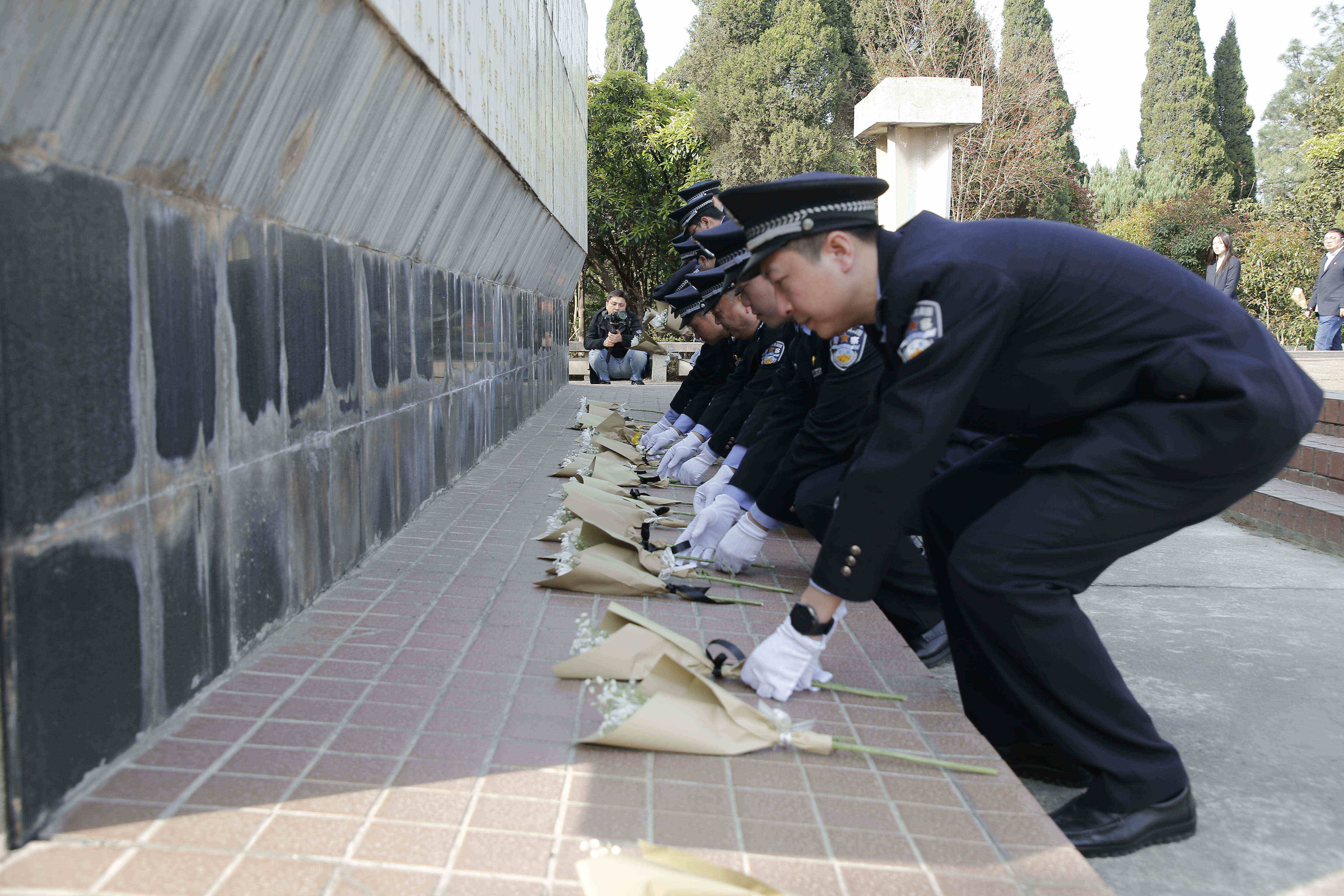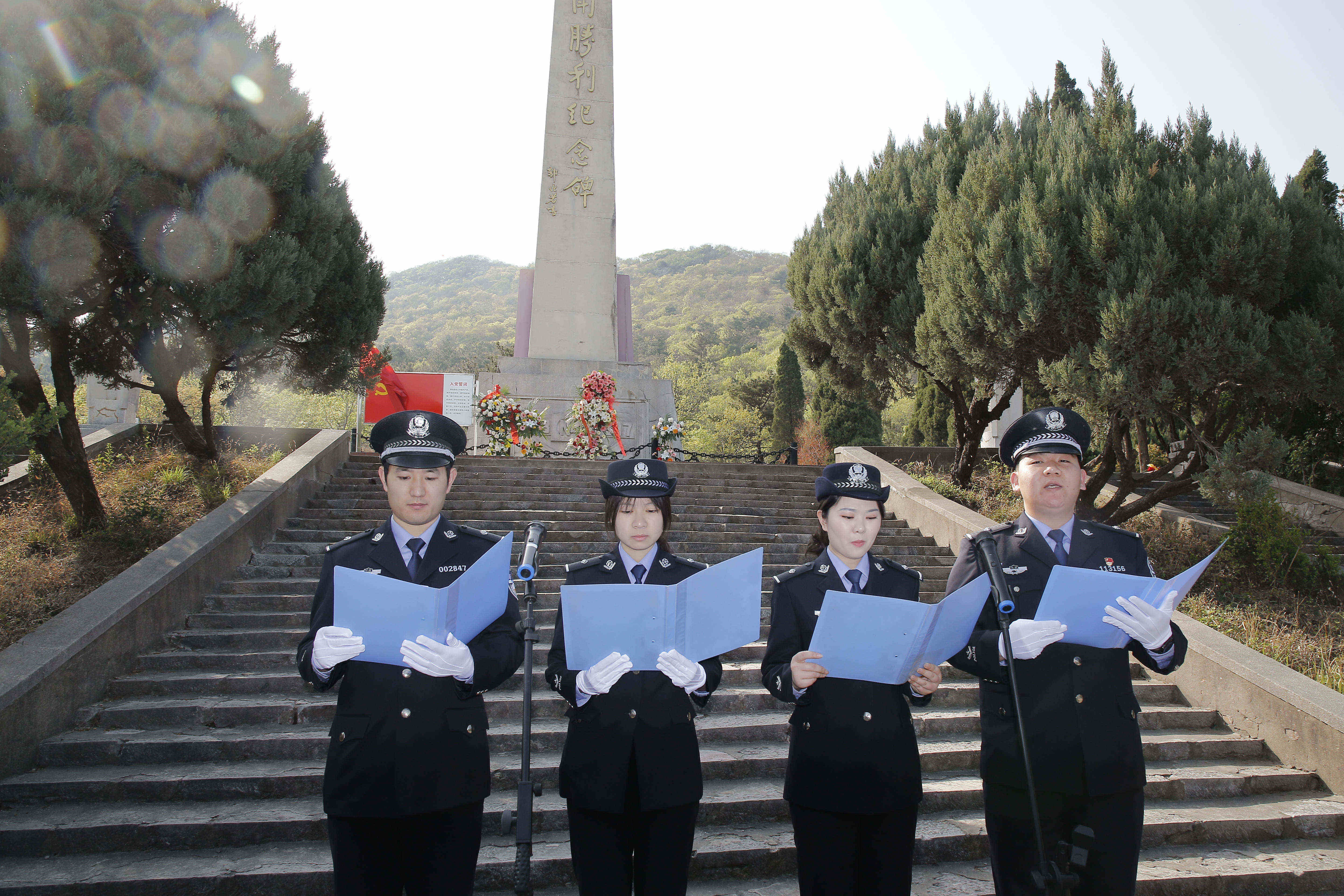 纪念碑前,全体人员肃立,公安民警脱帽默哀。随后,大家手持鲜花缓步绕行,瞻仰纪念碑,将鲜花轻轻放在纪念碑前,表达对革命先烈的缅怀和哀思。