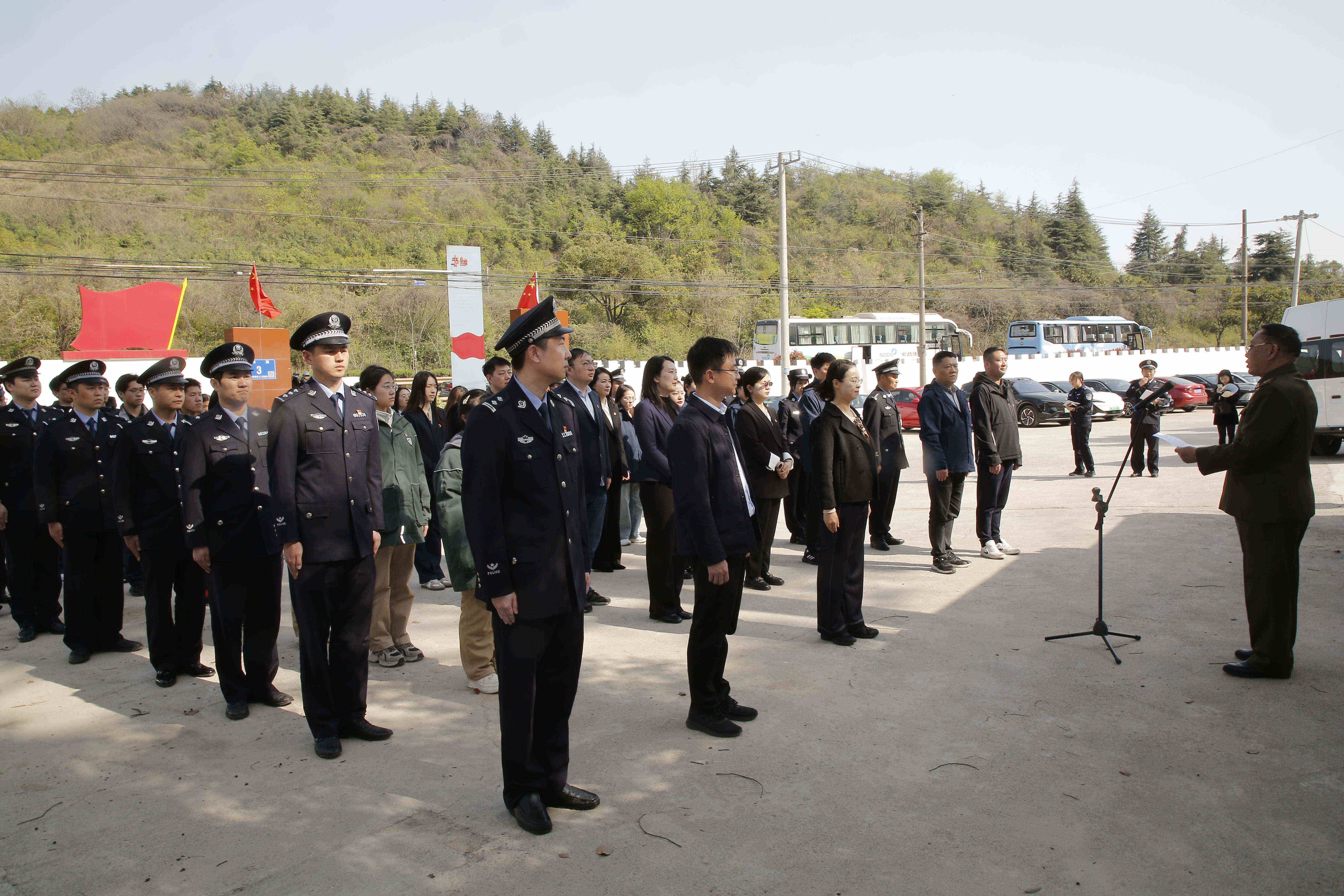 四月的高骊山草木蔓发,春山可望。巍然矗立的韦岗战斗胜利纪念碑下,警徽闪耀,誓言铿锵。