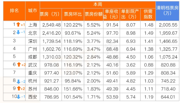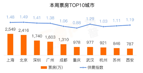 上周城市票房排名较前一周变动明显。武汉、苏州票房排名较前一周各上升2位,上海上升1位居首。头部城市中,北京、上海、深圳供需指数最突出,供需指数均在1.4及以上;其次是广州、武汉,供需指数均在1.2以上。