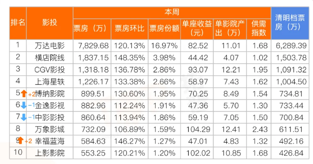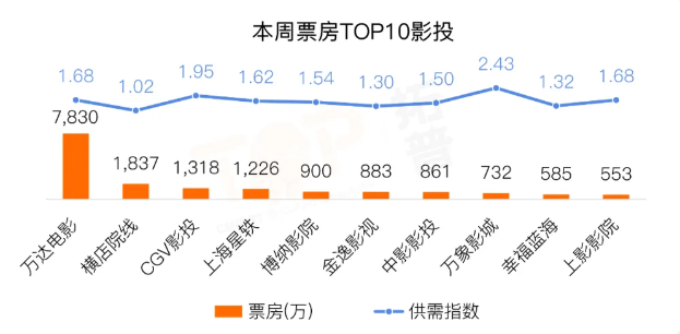 在重点影投方面,博纳影院、幸福蓝海票房排名较前一周各上升两位。头部影投中,万象影城排片效率最高,供需指数为2.43;其次是CGV影投、万达电影、上影影院、上海星轶,供需指数均在1.6以上。