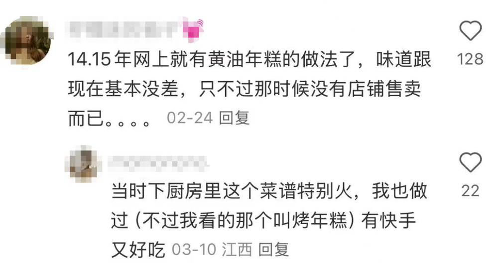 IP为江苏南通的一家独立烘焙店店主表示,早在2017年就用妈妈给的方子自制了黄油年糕;更有网友称其实早在2014年左右,下厨房上就有类似的菜谱,当时还叫“烤年糕”,只是当时还没有店铺售卖。