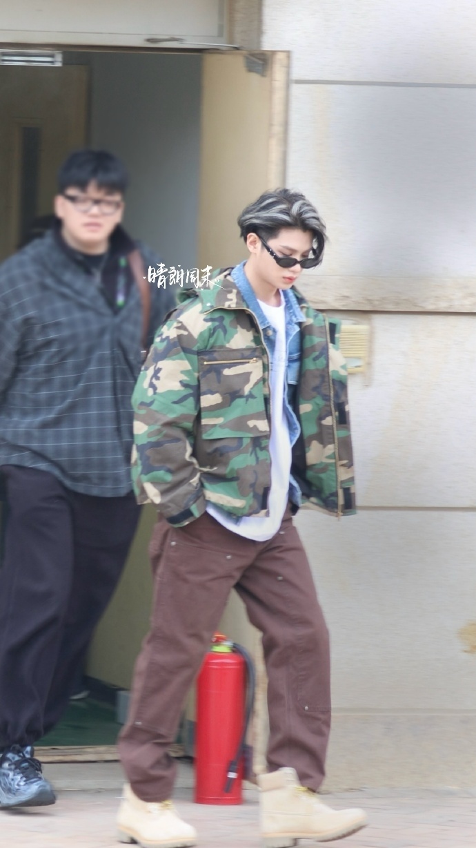 黄明昊叠穿look黄明昊挑染迷彩装黄明昊挑染迷彩装,是牛仔、迷彩叠穿look满