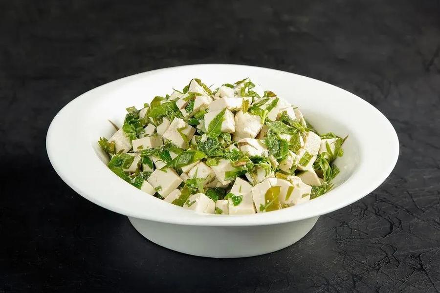 材料:香椿100g,嫩豆腐1块、盐、香油少许。做法:1.将香椿芽洗净后用开水焯烫1分钟,捞出沥干水分,切成细末;2.豆腐切块,沸水烫30秒;3.混合食材,加少许盐、香油拌匀,装盘即可。