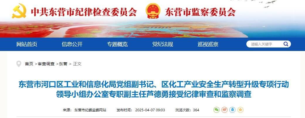 齐鲁网·闪电新闻4月7日讯据河口区纪委监委消息:东营市河口区工业和信息化局党组副书记、区化工产业安全生产转型升级专项行动领导小组办公室专职副主任芦德勇涉嫌严重违纪违法,目前正接受东营市河口区纪委监委纪律审查和监察调查。