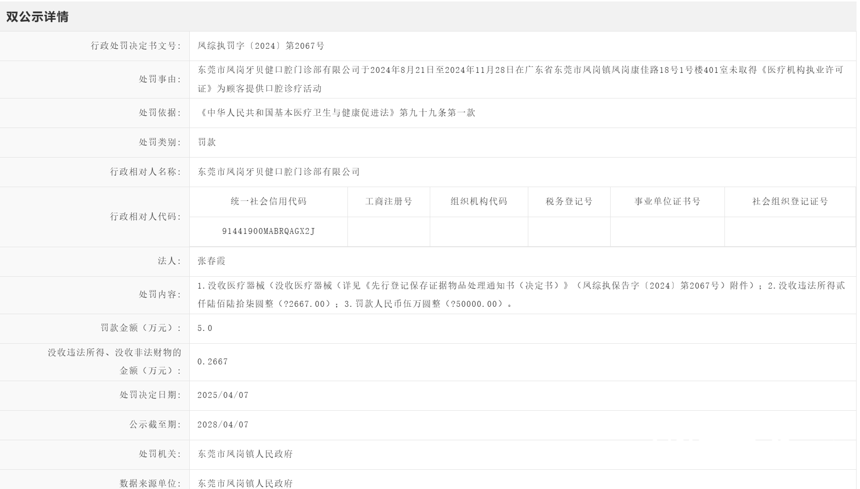 东莞市凤岗牙贝健口腔门诊部有限公司在未取得合法资质的情况下,非法开展口腔诊疗活动长达三个多月,最终被处以5万元罚款。4月7日,东莞市凤岗镇人民政府对外公布了针对该公司的处罚决定。