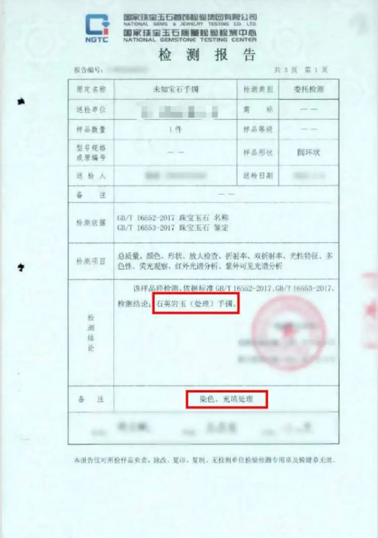 经专业鉴定,这只所谓的A级翡翠手镯,不过是残次石英石经过染色、酸洗注胶伪造而成,配套的鉴定证书同样系伪造。