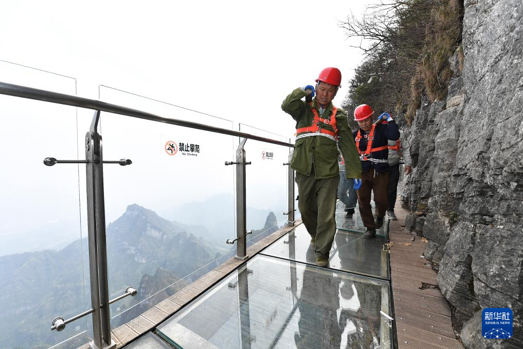 当日,湖南省张家界天门山景区对盘龙崖玻璃栈道的27块玻璃进行更换,确保游客在安全舒适的环境中游览体验。