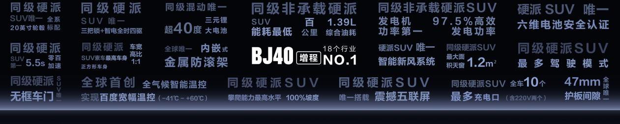 BJ40增程围绕“超级硬派、超级增程、超级越野、超级智享、超级安全”五大核心优势,实现了多项行业领先,包括同级硬派SUV素车最高车身、同级硬派SUV唯一全系标配20英寸轮毂、同级硬派SUV唯一无框车门、同级混动唯一超40度三元锂大电池、同级非承载硬派SUV能耗最低、同级非承载硬派SUV发电机功率第一、同级硬派SUV最快零百加速、全球首创全气候智能温控实现百度宽幅温控、同级硬派SUV拥有最多驾驶模式、同级硬派SUV唯一三把锁+智电全时四驱、同级硬派SUV攀爬能力最高水平、同级硬派SUV唯一搭载震撼五联屏、同级硬派SUV最大面积天窗1.2m²、同级硬派SUV最多充电口、全球唯一内嵌式金属防滚架、硬派SUV唯一六维电池安全认证、全球唯一47mm护板间隙、硬派SUV唯一智能新风系统。