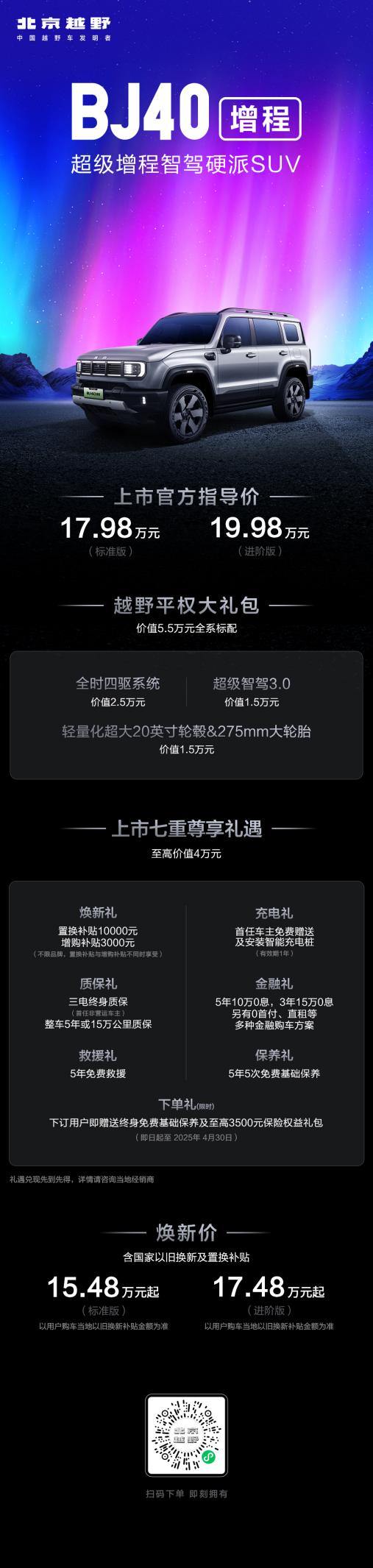 4月7日,“做增程硬派SUV之王BJ40增程,来了!”北京越野BJ40增程上市发布会在奥林匹克森林公园国家网球中心盛大召开。用户、媒体、合作伙伴、嘉宾等齐聚一堂,共同见证这一里程碑时刻。BJ40增程定位为超级增程智驾硬派SUV,标准版和进阶版两大车型官方指导价为17.98万-19.98万元,焕新价最低15.48万元起(叠加国补和置换补贴后),真正实现越野平权。