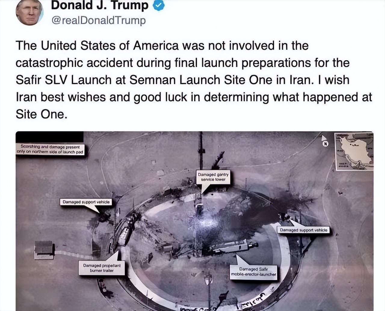 无独有偶,2019年,时任美国总统的特朗普在“推特”上发了一篇帖子,配图是伊朗卫星发射失败的画面。