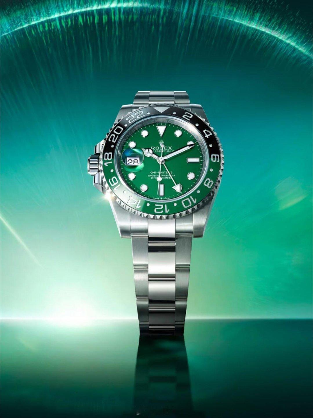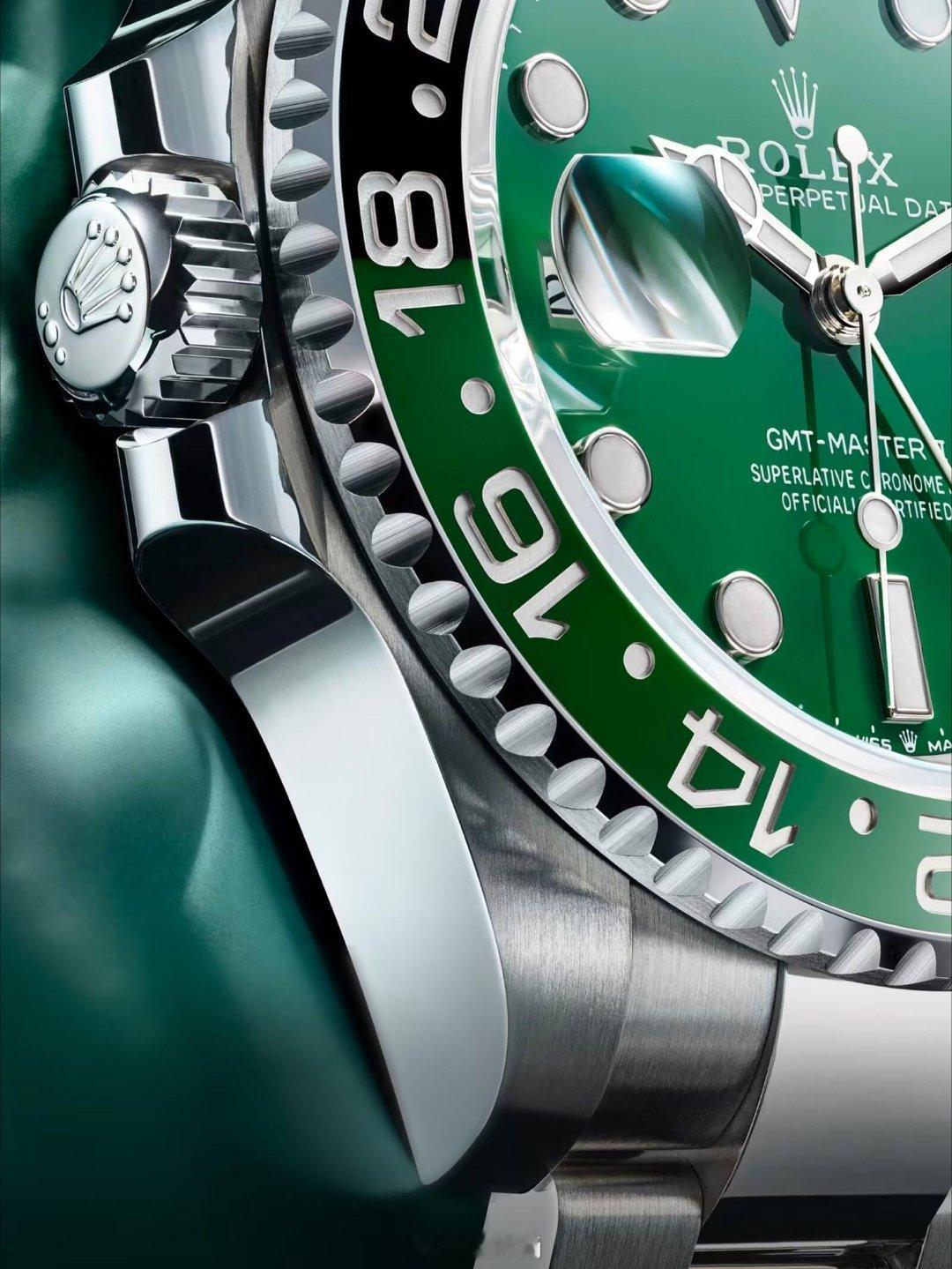 格林尼治型II GMT-Master II同样惊艳。首款全陶瓷表盘的诞生,是制表工艺的重大突破,绿色Cerachrom表圈与陶瓷盘面达成色阶统一,在不同光线条件下皆呈现和谐呼应的同色效果,双向旋转外圈上的Cerachrom字圈,其模铸刻度和数字经PVD镀上铂金,防刮损且色彩持久 。搭载的3285机芯,为两地时显示提供超卓准确度,动力储备约70小时,是环球旅行者的理想伴侣。