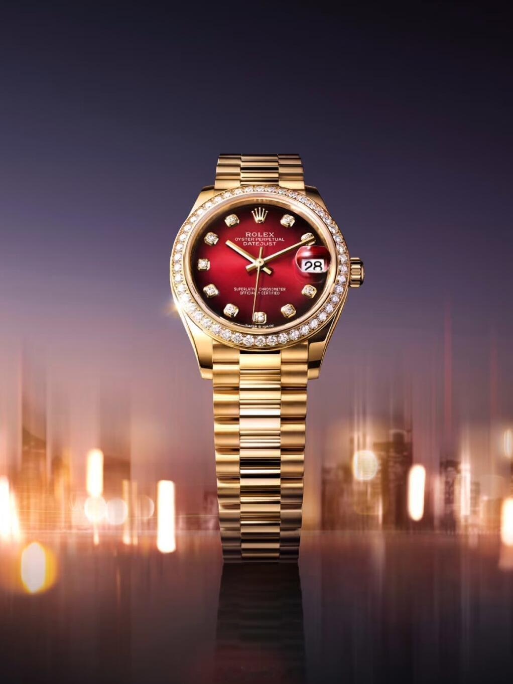 日志型31 Datejust推出渐变红PVD表盘,打破传统,如日暮时分的余晖,明艳炽烈 。46颗钻石外圈与太阳纹钻石时标交相辉映,在光线折射下构成光影交响曲。2236型机芯配备Syloxi硅游丝技术,有效抵抗磁场干扰,保持高度稳定,动力储备约55小时。
