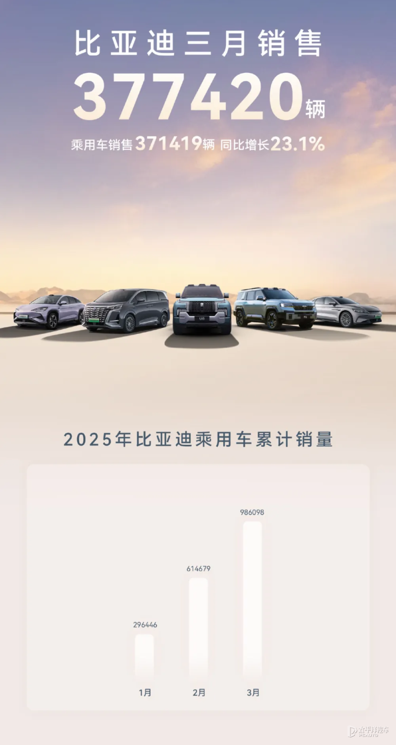 比亚迪一季度累计销售新能源汽车100.08万辆,同比增长59.81%,创同期历史新高。其中,3月单月销量达37.74万辆,同比增长23.1%。