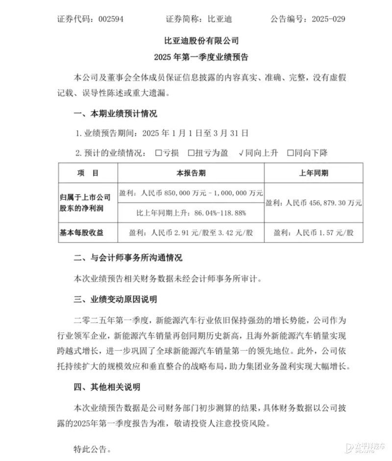 日前,比亚迪股份有限公司(002594.SZ;01211.HK)发布2025年第一季度业绩预告,预计实现归属于上市公司股东的净利润85亿-100亿元,同比大幅增长86.04%-118.88%。按此测算,比亚迪一季度日均净利润接近1亿元,盈利能力稳居国内车企榜首。